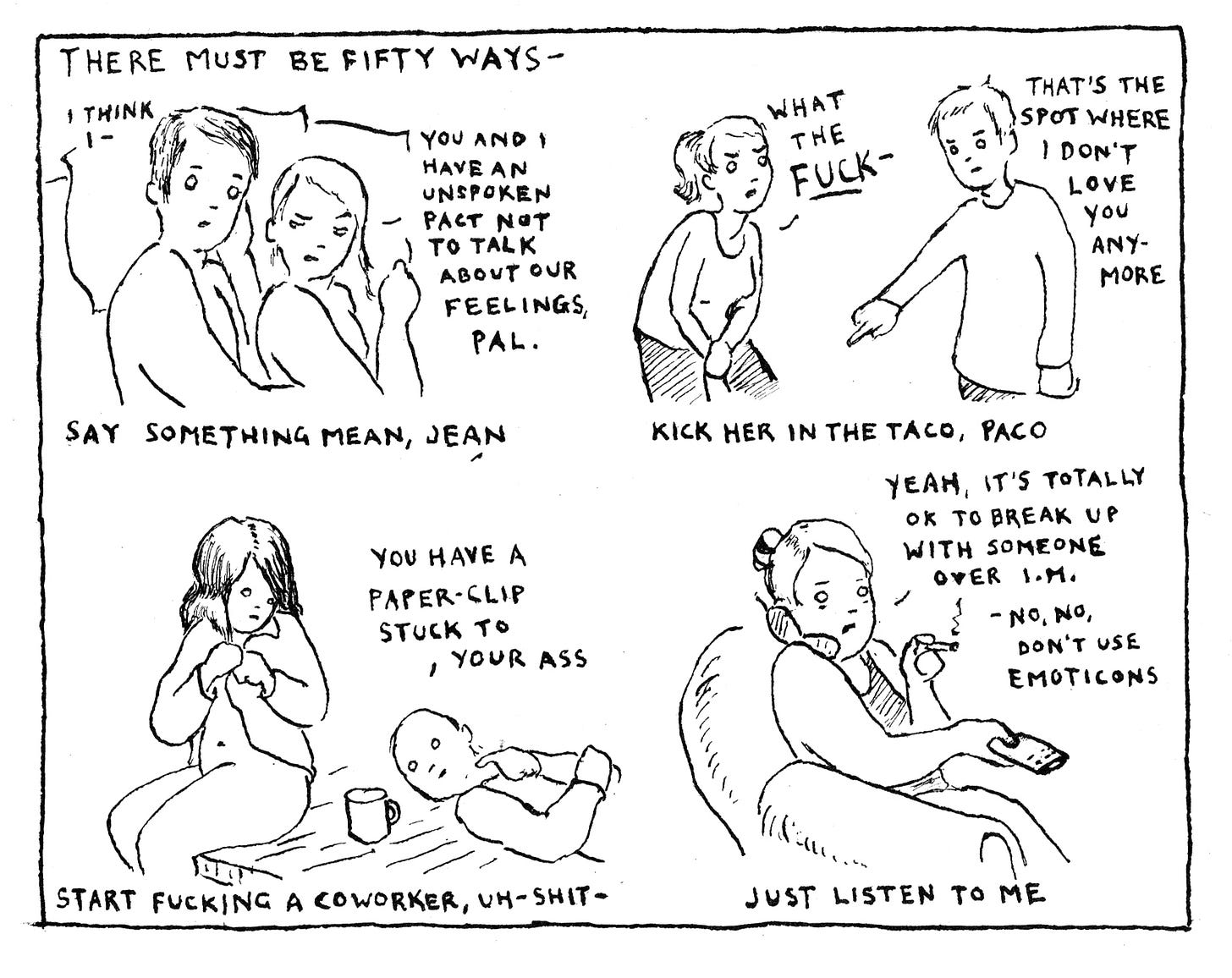 And here’s a very early Lulu, just so you know part of what you’re getting into here. As you might glean from the reference to “I.M.” and “emoticons,” this is from Long Ago (I want to say 2004, around the time I did indeed start fucking a co-worker, and reader, I married him) (for real!), but “That’s the spot where I don’t love you anymore” remains one of my favorite lines I’ve ever written, so do with that information what you will.
